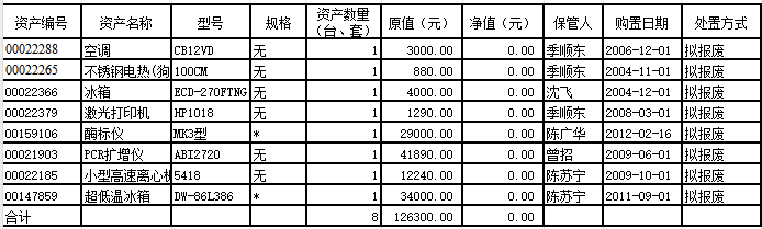 根据《苏州大学国有资产管理办法》、《苏州大学无形资产管理办法(试行)》、《苏州大学固定资产清查盘点实施细则》和《苏州大学低值耐用资产管理办法》等文件要求,本次清查盘点工作以2025年11月30日为基准日,范围为学校实际占有和使用的全部资产,包括流动资产、固定资产、在建工程、无形资产、对外投资、低值耐用资产等。经会议研究决定,江苏省血液研究所共有资产213件,其中8件资产需要申请报废,资产原值共计126300.00元。现予以公示。